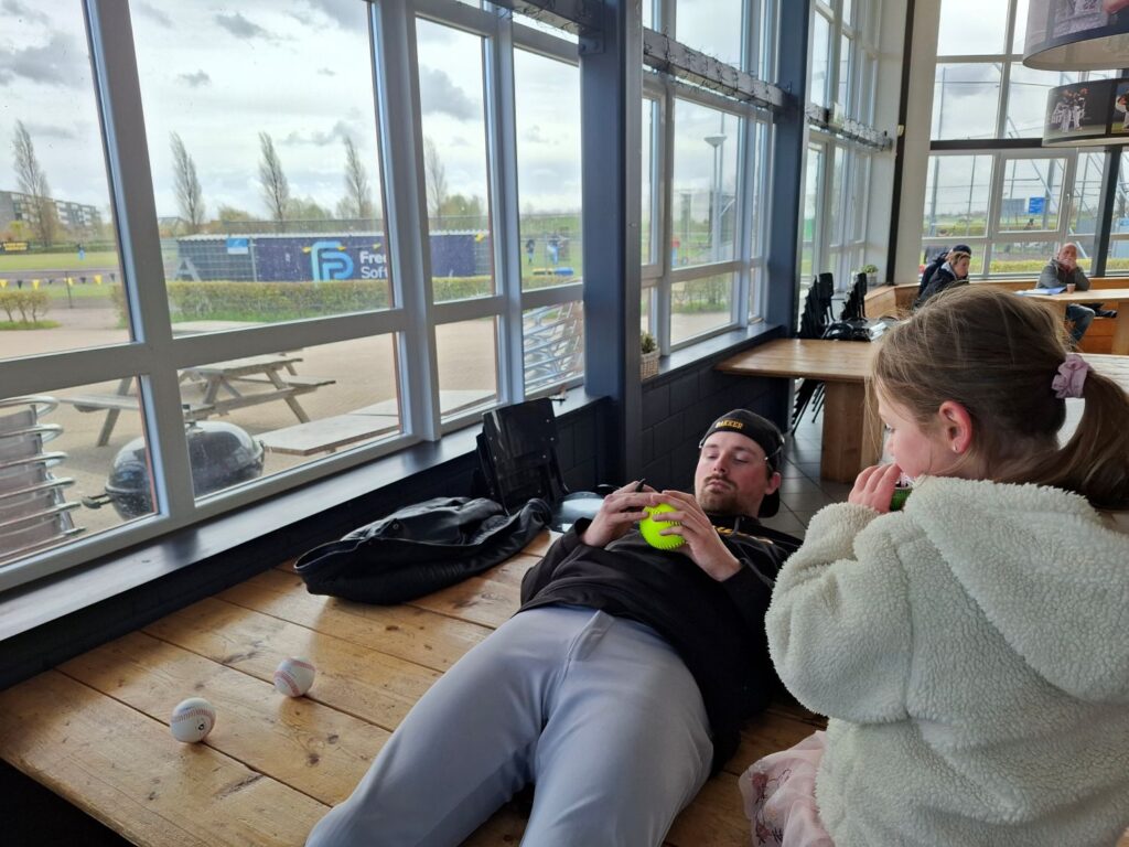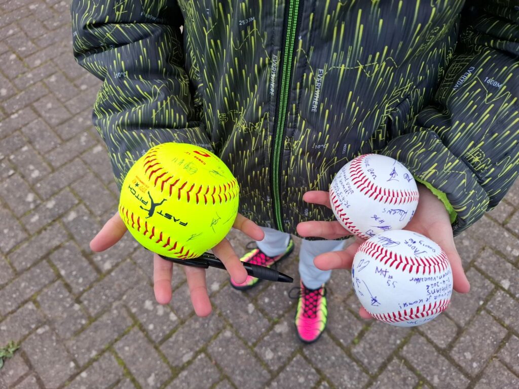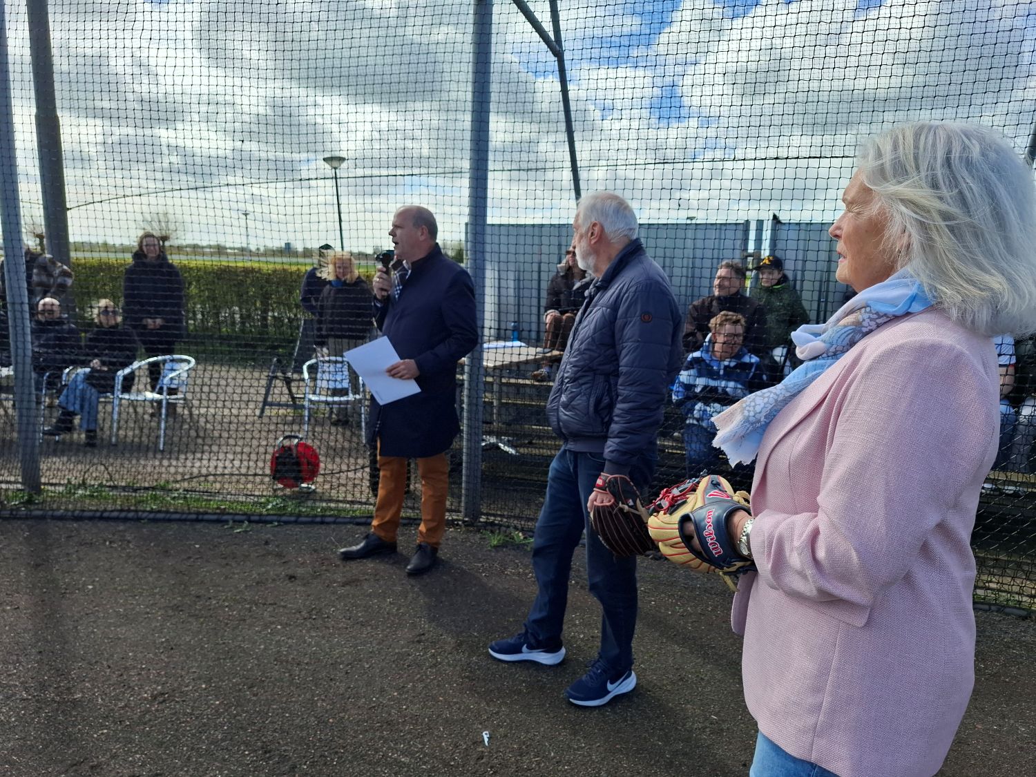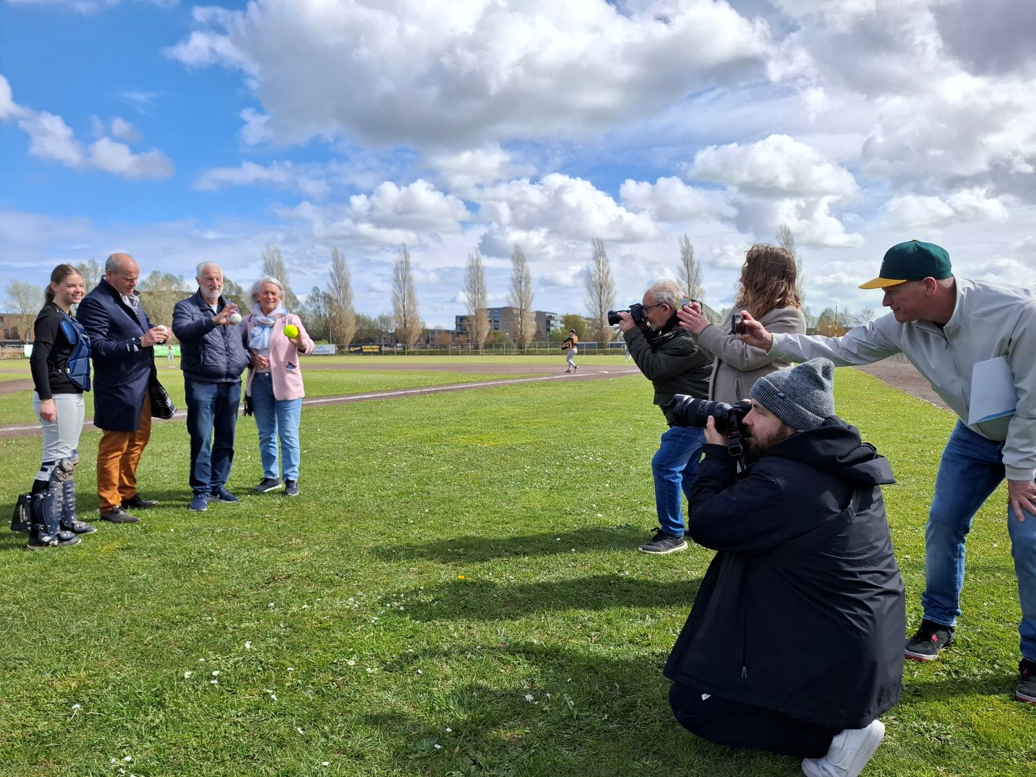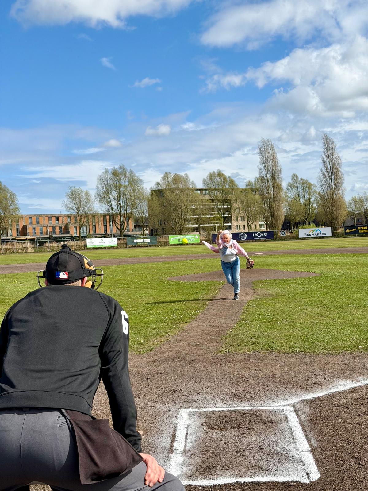 Er werden zowel honk- als softballen geworpen, omdat dit weekend zowel het honk- als het softbalseizoen weer van start is gegaan. Vera (SB U15) was de catcher van dienst voor de pitch van Irene, die keurig over de thuisplaat in de handschoen van Vera belandde.